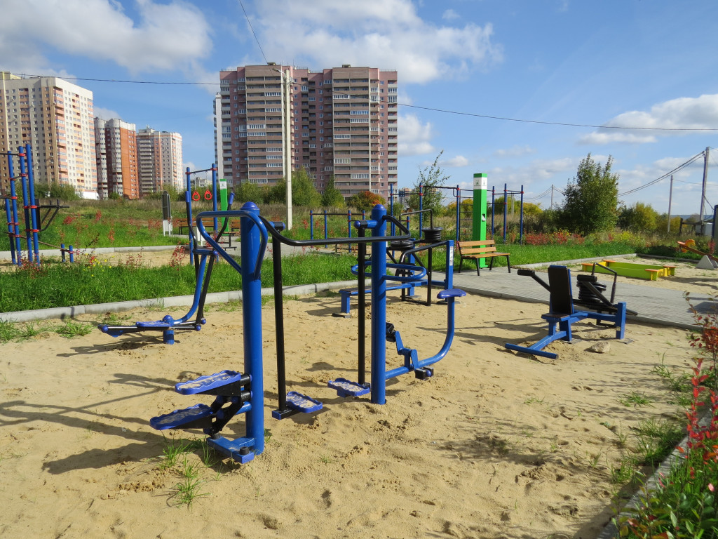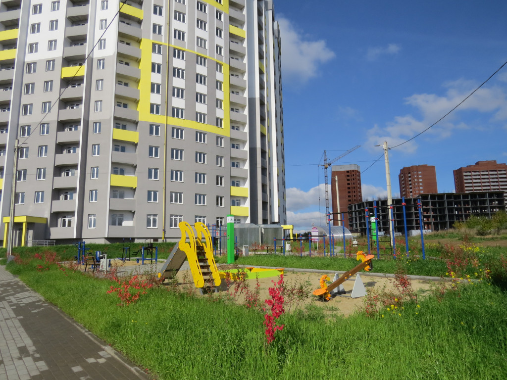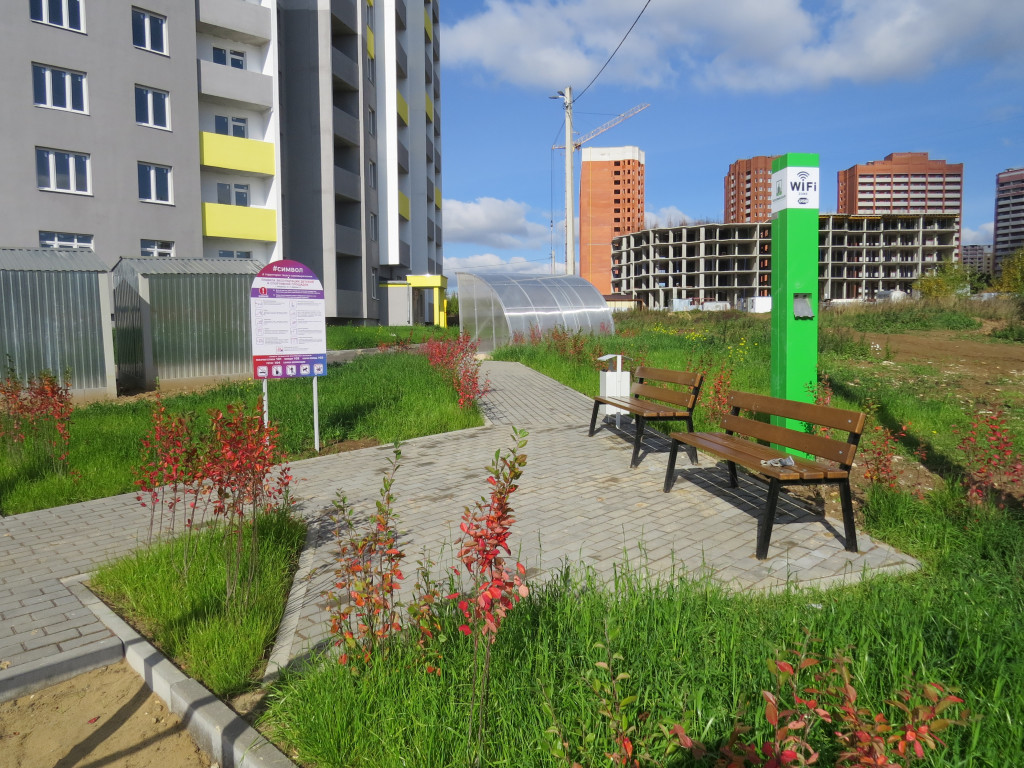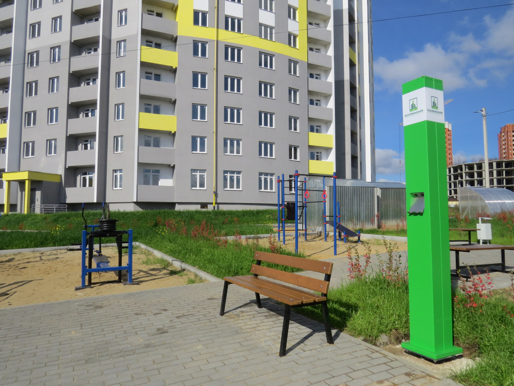 Современный стильный жилой комплекс выгодно отличается от соседней застройки ярким фасадом. Во дворе установлено много спортивного оборудования для жителей, велопарковки, велобокс, а также двор оборудован специальными стойками для зарядки гаджетов.