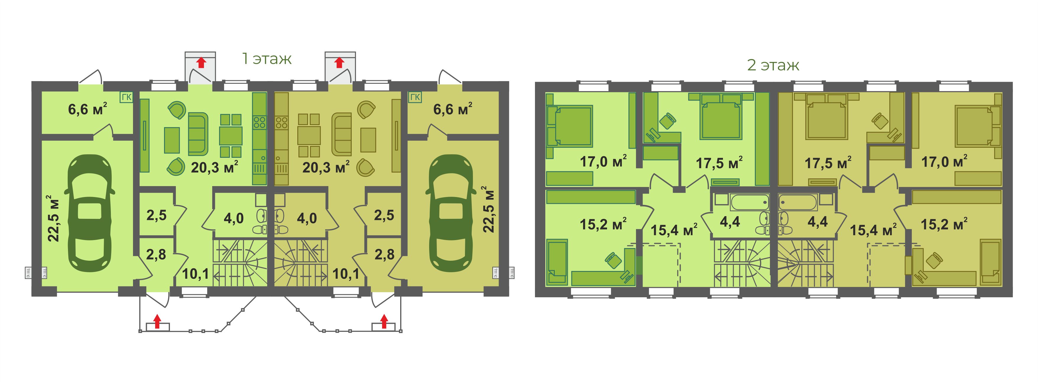 Дом состоит из двух квартир одинаковой площади – 138,3 кв.м. В каждой квартире:
