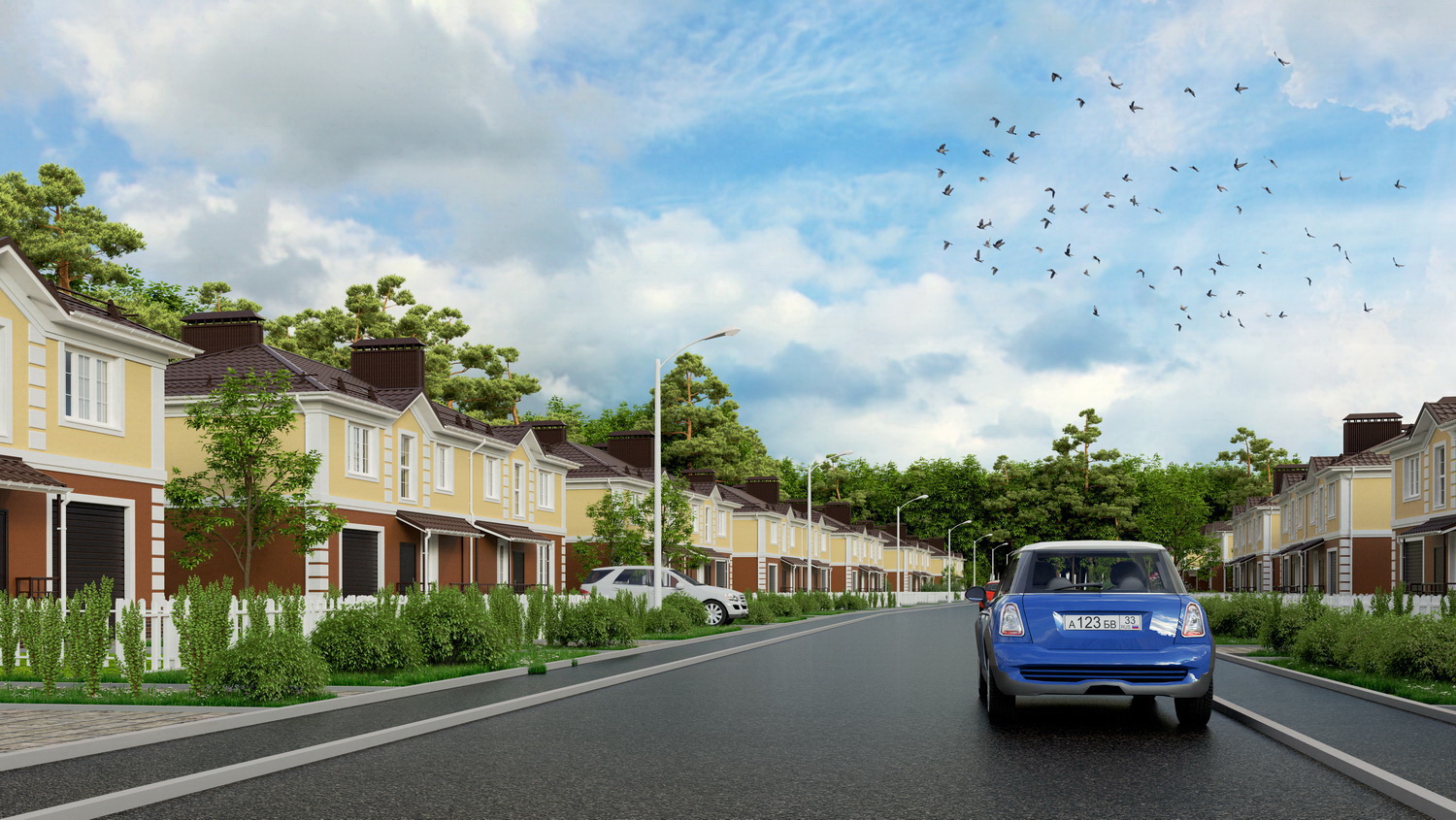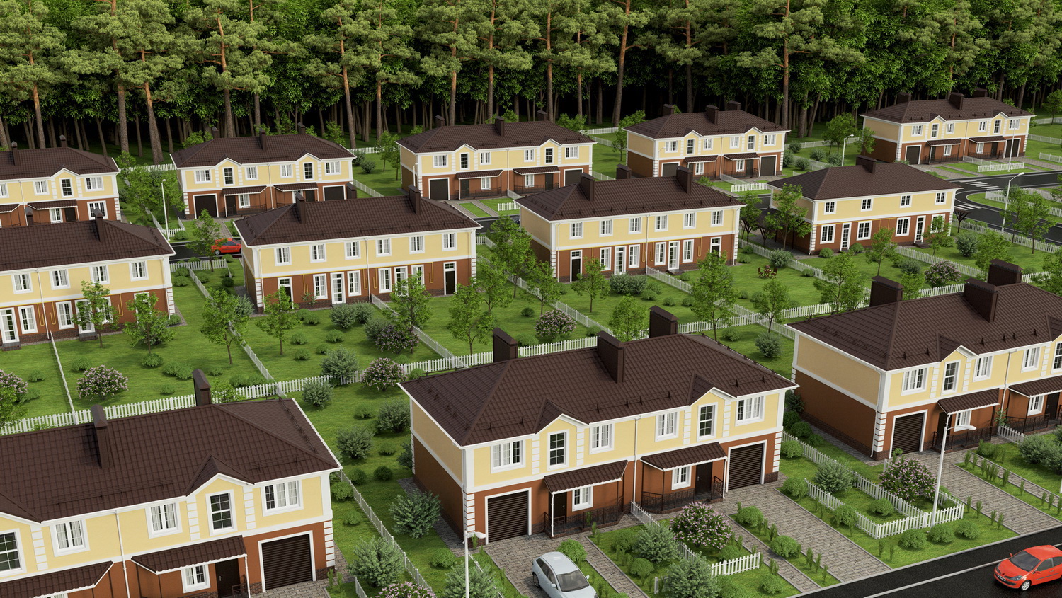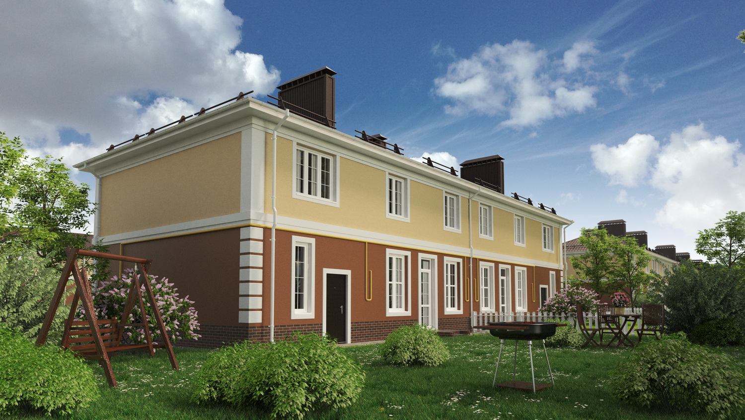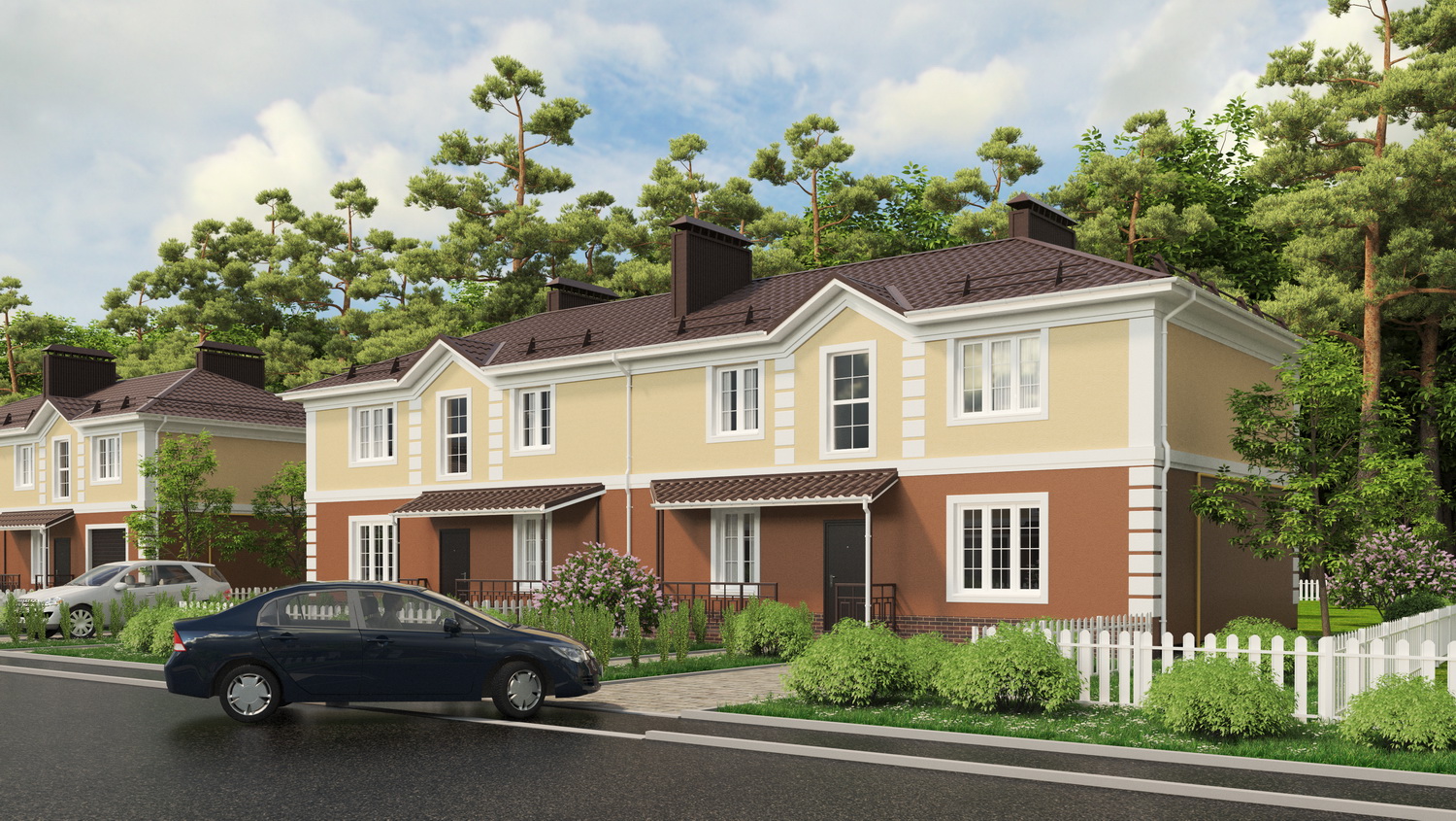 У каждой квартиры в доме есть собственный земельный участок, огороженный аккуратным заборчиком.