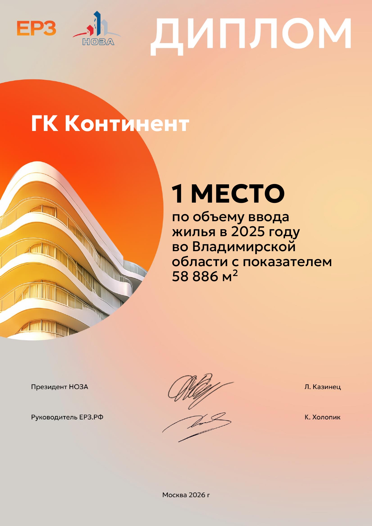 В 2020 году мы заняли первое место в рейтинге Единого реестра застройщиков Владимирской области по потребительским характеристикам. Этот показатель в очередной раз доказывает, что мы стремимся предложить клиентам отличное качество строительства и клиентского сервиса, не просто строим, а продумываем и совершенствуем.