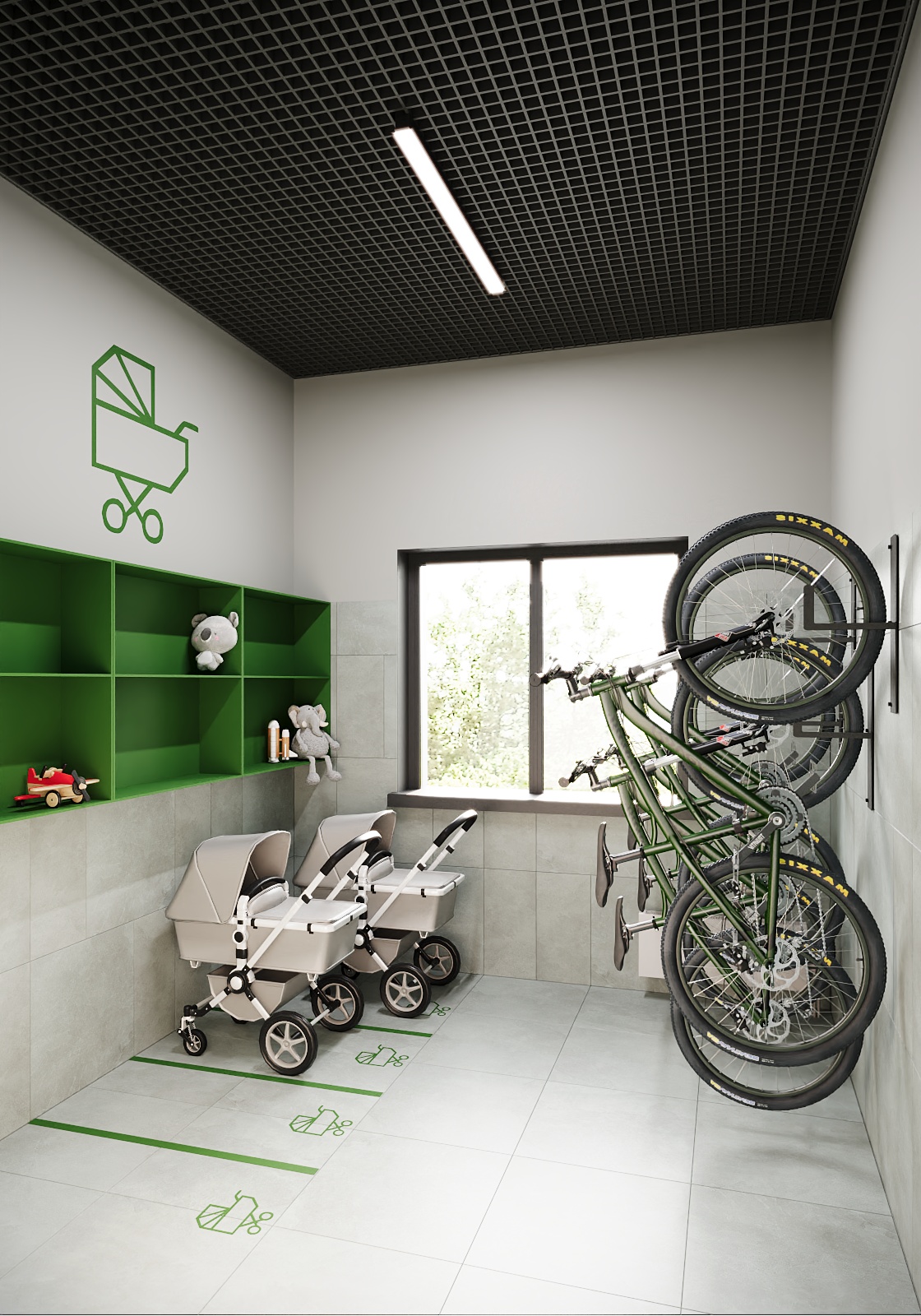 Просторные колясочные — здесь можно оставить не только коляску, но и ватрушки, игрушки, даже небольшой велосипед.